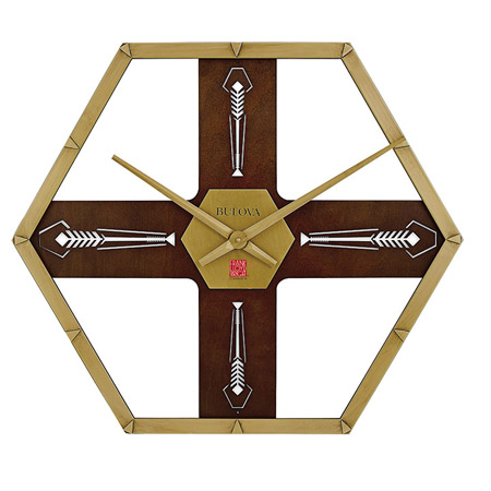Inspired by Frank Lloyd Wright 1923 design of the Imperial Hotel. In Honor of the 100th anniversary of his design. The gold finish case shape, triangle raised hour markers “peacock feather" design are all Wright architectural elements. This unique clock's walnut finished frame is back lit automatically in low light.The LEDs are battery powered and have adjustable settings. The Accurate quartz movement uses 1 AA battery, and the LEDs are powered by 4 D Cell batteries ( not included)