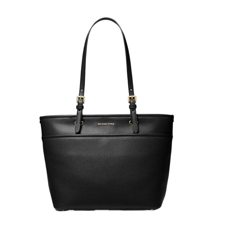 The Winston Tote from Michael Kors is made of pebble embossed leather with gold hardware and features a top zip closure, a back zip pocket, and 2 front zip pockets inside. Dimensions: 14" x 11" x 18". Weighs 2 pounds.