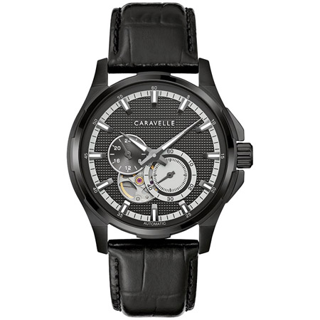A stylish, contemporary Caravelle timepiece, this black-tone dress watch features luminous hour markers and hands, a small seconds display, and an aperture to view the 21-jewel automatic movement inside. The robust 42-hour power reserve will keep you on time day and night.