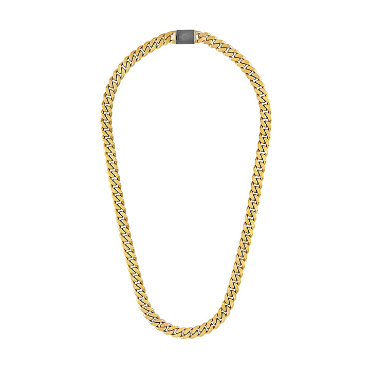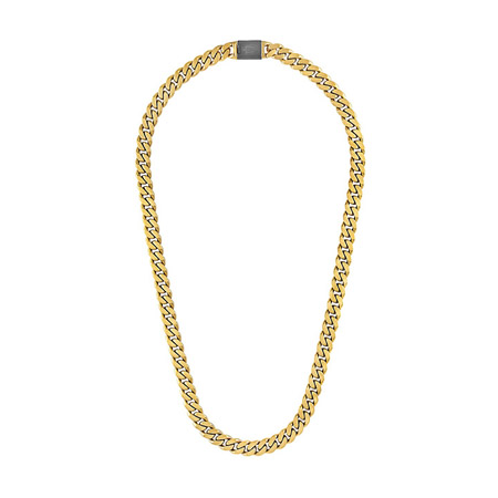 This classic men's curb necklace is a traditional Bulova classic with a colorful, updated twist with a distinguished blend of dual-surfaced links. This is a sleek, contemporary 24” chain made of 10mm gold-tone stainless steel combining both polished and brushed finishes. The custom-designed black clasp has a tongue in the shape of the Bulova signature tuning fork.