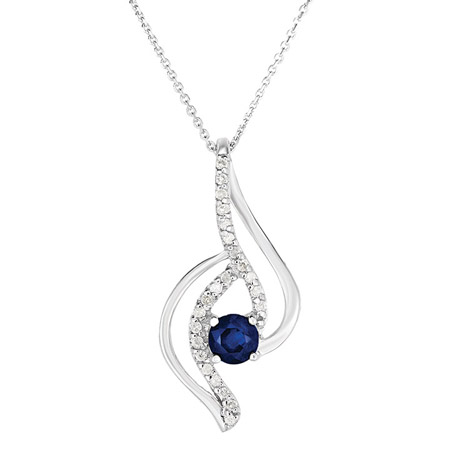Alluring and dazzling, this necklace features a 4mm genuine sapphire embraced by swirls of 10k white gold accented with .10twt round diamonds. The 18" cable chain is secured with a spring ring clasp.