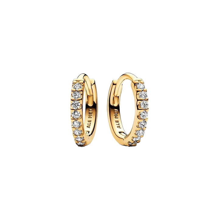 Embrace delicate sparkle when you wear these huggie hoop earrings from Pandora. These 14K gold-plated hoop earrings are set with a row of clear cubic zirconia, making them versatile and classic. Whether you wear them solo or stack them with other styles, they will elevate your everyday.