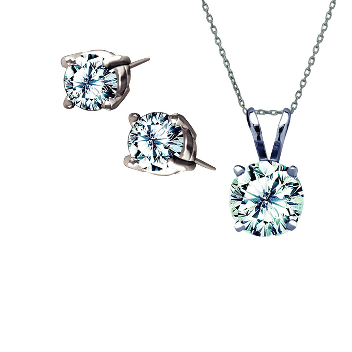 Timeless, beautiful royal stud earrings from Antwerp are nestled in a classic, four-prong setting in sterling silver. They include round cubic zirconia totaling 2.00 carats. The necklace radiates in classic sterling silver, and its 1-carat cubic zirconia pendant is also in a four-prong setting. Each cubic zirconia is set by hand by master craftsmen.