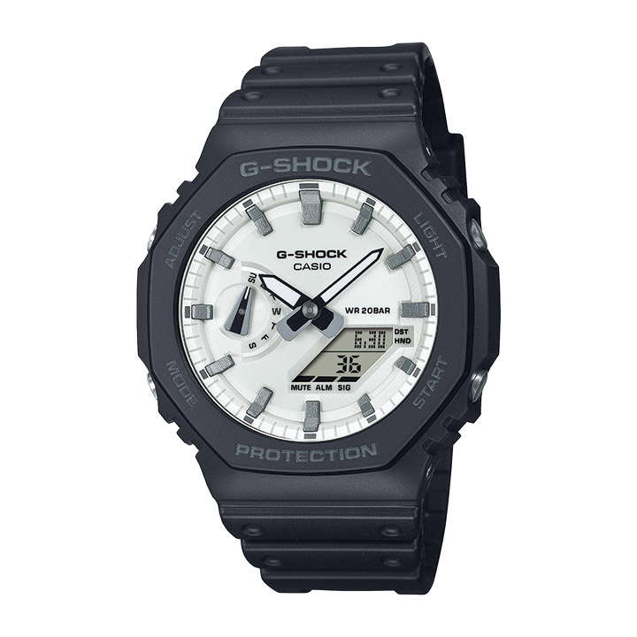 This men’s G-Shock octagon slim watch has a black resin band and Carbon Core guard structure case, white analog/digital dial with two hands and hour markers, double LED light, world time, countdown timer, five daily alarms, and an hourly time signal. The analog display shows two hands, while the digital display shows time and date. Water resistant to 200M. The case measures 48.5mm x 45.4mm.
