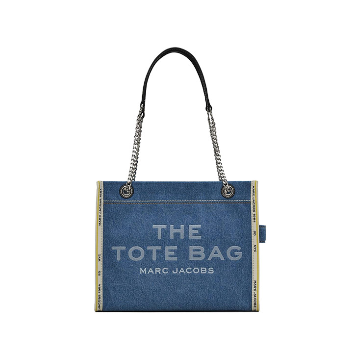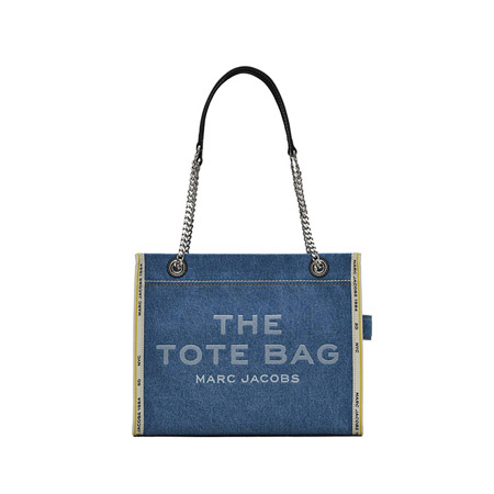 An iconic Marc Jacobs silhouette, this zip-top medium tote in deluxe structured denim features signature embroidered namesake branding, an elevated chain strap with leather guard detailing and Marc Jacobs' essential carryall design. Wear over your shoulder or carry by leather-chain top handle for handheld styling. Dimensions: 5.91" x 10.24" x 12.99".