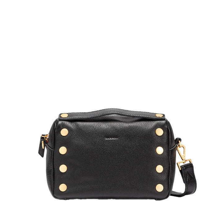 Designed for people who prefer a compact crossbody with a relaxed look, this bag can be worn over the shoulder with a removable, adjustable crossbody strap. Or, carry it by its elevated top handle. This design pays homage to camera bags, with an East-West look. Featuring Hammitt's signature combo of black leather, brushed gold hardware and a statement red zipper. Dimensions 8.25" x 4.25" x 5.25".