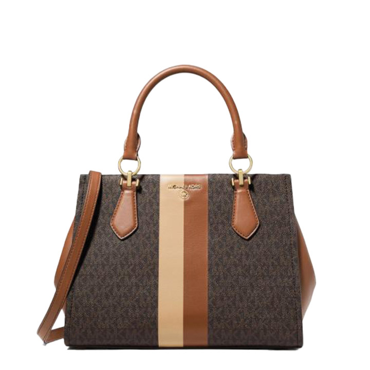 MICHAEL KORS MARILYN MEDIUM LOGO STRIPE SATCHEL.